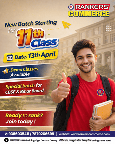 Rankers Commerce is best commerce coaching in Patna and offering top academic and professional courses for 11th & 12th commerce students include prestigious professional qualifications like CA, CS, CUET, CMA, and CFA, alongside robust degrees like BBA, B.Com Courses. We have branches in Boring Road, Kankarbagh in Patna, Bihar. We provide best commerce classes for 11th and 12th commerce with qualified professionals in our coaching institute.